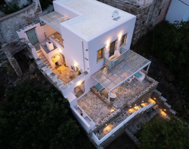 „The Nest, this cycladic villa will bewitch you with its uniqueness, charm and laid back atmosphere. 3 cycladic cube-shaped buildings have been restored & transformed into a secluded, tranquil & laid- back villa-complex, around an open air patio....